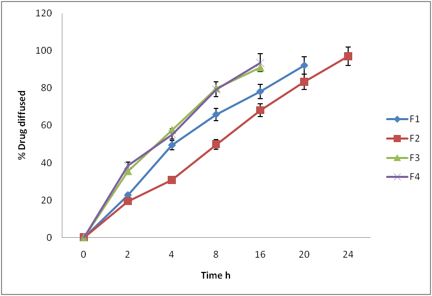 Fig. 7: Comparative drug release profile of SLNs-F-1, F-2, F-3 and F-4. All values shown in graph are measured asmean±SD, n=3
