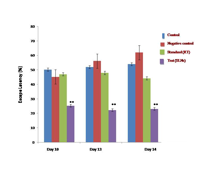 Examining answers linked to memory was done using the Plus Maze test. Equipment for making the plus sign that has two open arms and two closed arms, each measuring 5 cm by 30 cm. All of the animals received a 7-day course of treatment. Group 1 received saline as the vehicle, Group 2 received scopolamine in the vehicle, Group 3 was used as the standard, and the animals in this group received rivastigmine tartrate (2 mg/kg) solution in PBS (containing 2.5% compritol 888 ATO) with scopolamine, and Group 4 received the test formulation, rivastigmine tartrate SLNs (2 mg/kg) with The second, third, and fourth groups received scopolamine injections (1 mg/kg, i. v.) after treatments on the seventh day of the trial. Animals were placed one by one at the end of an either open arm after 30 min after scopolamine administration, and the amount of time it took them to go from open to the closed arm was recorded as transfer latency (TL1). The operation was repeated after 24 h, and TL2 was once more recorded as a memory parameter [22].