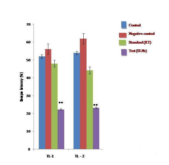 The elevated plus maze experiment is predicated on the idea that rats prefer closed arms to open arms. Transfer latency is a measure of learning/memory based on the amount of time rats took to go from an open arm to an enclosed one (TL). If the animal has already entered the closed arms, the transfer delay is reduced. This suggests that memory may be involved in the decreased transfer delay. The animals were placed in the experiment one after the other at the end of the open arm, farther away from the centre. The same process was carried out three times for each group. The animal's travel time from the open to the closed arms was measured as TL1 during the first trial (pre-test). Rats were placed in the enclosed arm and given a further 60 seconds to explore if they did not reach the closed arm within the 90s, in which case TL1 was regarded as the 90s. After 24 h, the test was conducted in a manner identical to that of the primary trial for the second (retention) trial in order to record TL2. TL1 and TL2 did not differ significantly in the control group, which is attributable to the lack of any therapy, whereas TL2 increased dramatically in the negative control group after receiving scopolamine as a treatment (fig. 9). This can be the result of amnesia brought on by scopolamine. Both the standard and test formulation groups had a statistically significant decline in TL 2, which may have been caused by the training-induced memory retention, although the impact was most pronounced in the test formulation group (RT-SLNs). Anand et. al, 2019 conducted the same animal model study of SLNs for rivastigmine and the observation were similar to our results [7].