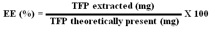 Where TFP extracted is the amount of drug recovered from a known weight of drug-loaded microspheres, TFP theoretically present is the drug expected in an equivalent weight of microspheres. The entrapment efficiency was assessed in triplicate, and the findings are reported as mean±SD.