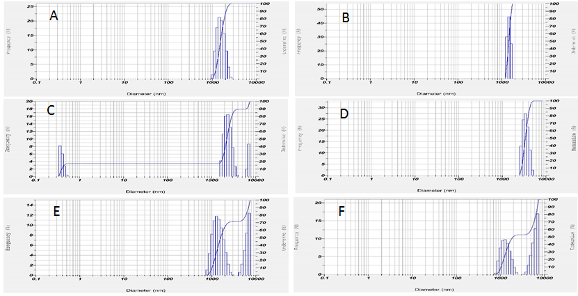 Fig. 1: Results of size distribution analysis (A: TF-1, B: TF-2, C: TF-3, D: TF-4, E: TF-5, F: TF-6)