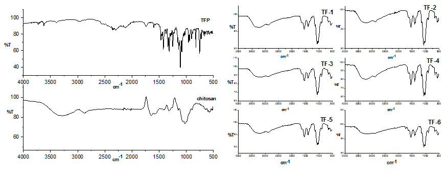Fig. 2: FT-IR spectra of TFP; Chitosan and spray-dried TFP-chitosan microspheres (TF-1 to TF-6)