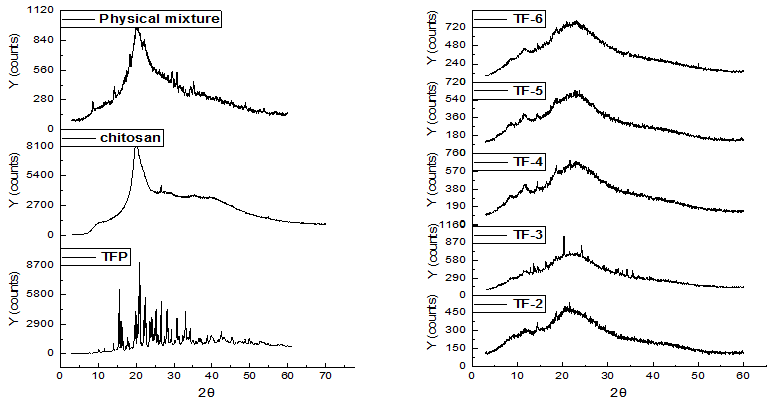 Fig. 4: X-ray diffraction patterns of TFP, chitosan, physical mixture of chitosan-TPP-TFP and spray-dried TFP chitosan microparticles; TF-2 to TF-6