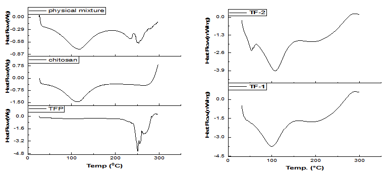 Fig. 5: DSC thermogram of TFP hydrochloride, chitosan, physical mixture and spray-dried TFP-chitosan microparticles (TF-1 and TF-2)