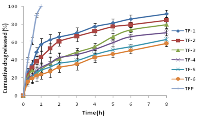 Fig. 6: In vitro drug release pattern of TFP-chitosan microspheres (TF-1 to TF-6) in phosphate buffer pH 7.4. Data represents mean±SD (n=3)