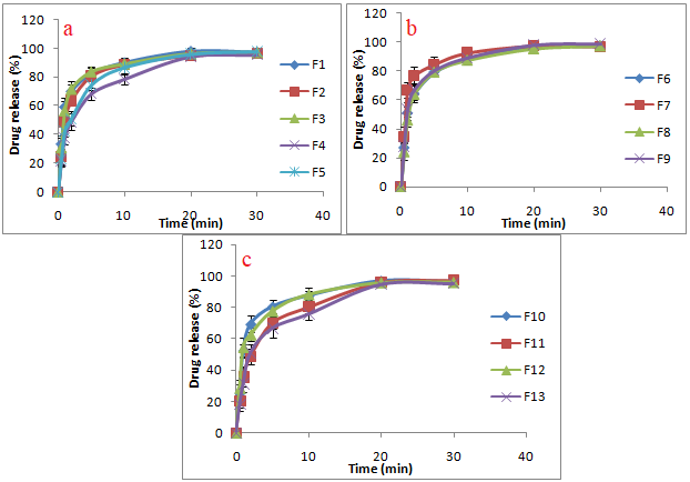 Fig. 1: In vitro drug release profiles of sublingual films a) from batches F1-F5 b) from batches F6-F9 and 1c) from batches F10-F13 (mean±SD, n=3)
