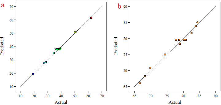 Diagnostic plots (such as predicted vs. actual) are useful graphic tools to observe the adequacy of developed models. It shows the relationship between predicted and experimental values and describes model suitability. Table 5 shows the predicted and experimental values of disintegration time and in vitro drug release of the films and fig. 2a and 2b show the predicted vs. actual plots for all responses. The closer the points are to the diagonal line, the better the model fits the experimental data [22].