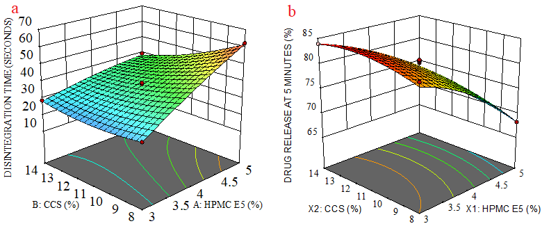 Fig. 3: 3D response surface plots of FDFS for the effect of independent variables on a) disintegration time and b) drug release at 5 min