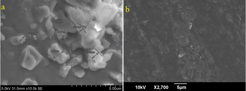 Fig. 6: Scanning electron micrograph of a) tacrolimus monohydrate, b) optimized film (magnification 2700×)