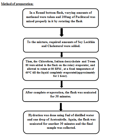 Our research effort aims to formulate the paclitaxel liposome by using cholesterol, sodium deoxycholate, and soy lecithin. The formulation is designed to reduce the various limitations of liposomes associated with the various combinations of polymers and other stabilisers that are under research right now. Some of them are not good candidates, while others produce toxic effects in patients who are already in a diseased state and are in distress. Our formulation is superior in the selectivity of various combinations of cholesterol, sodium deoxycholate, and soy lecithin with the solvent, which is the methanol-chloroform mixture, which after extensive literature review, was found to be the most suitable combination of solvent used in the preparation of liposomes [7].