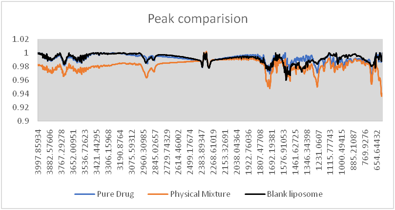 Fig. 2: IR spectra of Pure drug, Physical mixture and blank liposome