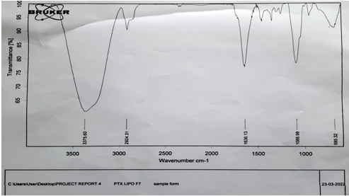 The drug, polymers, and prepared liposomes were subjected to FTIR analysis. Using KBr powder, the samples were scanned on a Bruker Fourier transform infrared (FTIR) spectrometer over a range of 400–500 cm1.