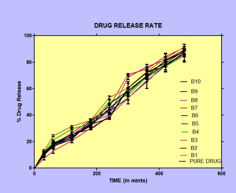 In vitro drug release studies of all the batches of the liposomes (B1-B10) revealed that the drug release range was 76%-98% shown in fig. 4 [17, 18]. In vitro drug release study of 10 batches of liposomes can be presented in the following order: B3<pure drug<B10 <B4<B2<B5<B9<B6<B1<B8<B7.