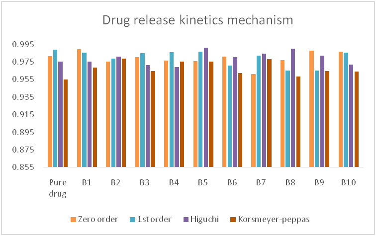 In vitro drug release data of 10 batches (B1–B10) was fitted to the zero-order, first-order, Higuchi, and Korsmeyer–Peppas models to determine the appropriate drug release kinetics model for every batch.