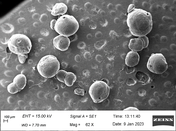 Fig. 6: SEM image of optimised liposome batch in different size ranges (100 µm and 1 µm)