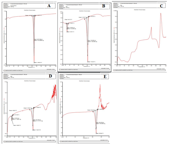 Fig. 7: Differential scanning calorimetry (DSC) A. Cholesterol, B. Sodium deoxycholate, C. Cholesterol, and Sodium deoxycholate, D. Cholesterol, Sodium deoxycholate, and Paclitaxel, E. Paclitaxel)