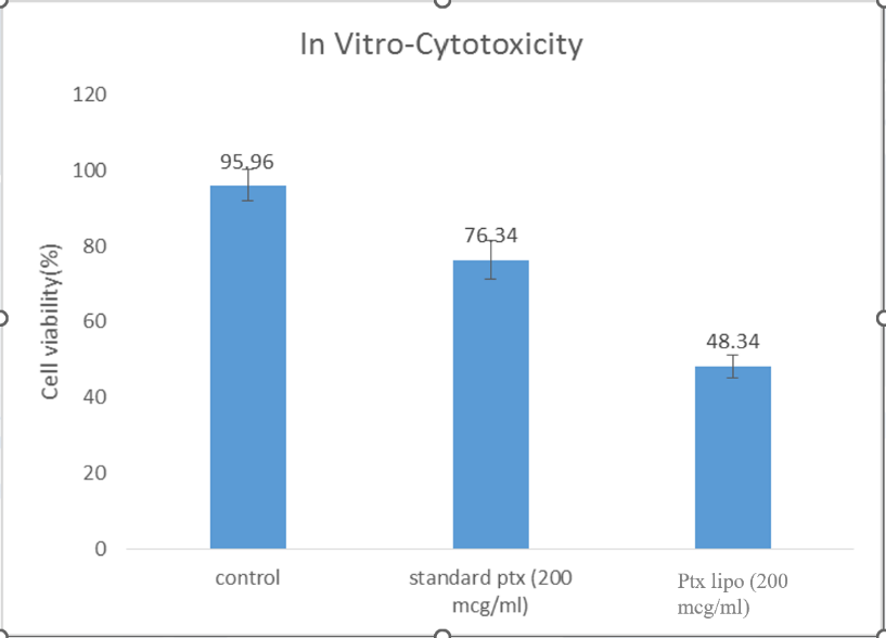 The measure of cell viability shows a stark difference between the three formulations, that is control, standard PTX and PTX liposomes (fig. 9) where cell viability was found to be lowest in liposomes (48.34%), proving it to be indicative of positive response to move this formulation for further studies.