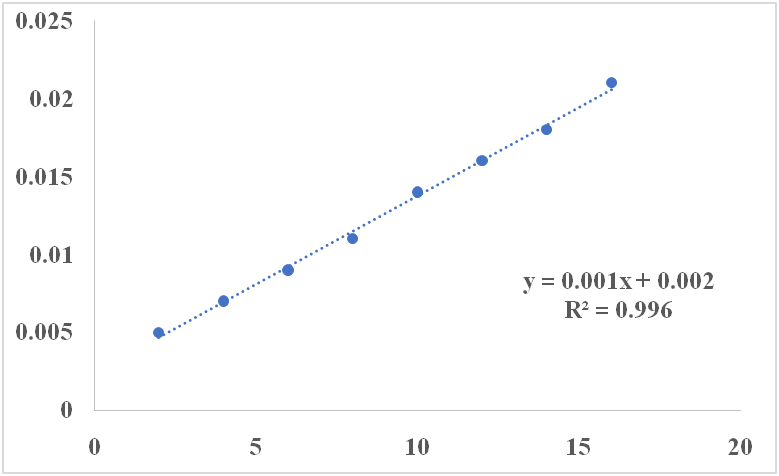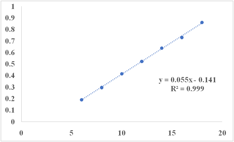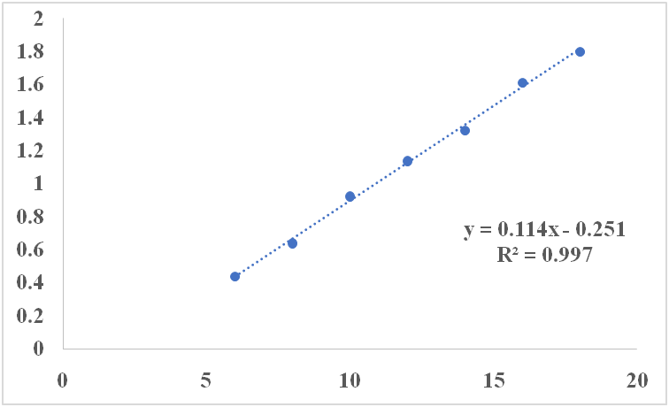 For methods A, C, and B in linearity studies, the concentration range for the calibration curves was 6–18 µg/ml and 6–20 µg/ml, respectively. The linear regression equation of method A is y = 0.0554x-0.1414 with a correlation coefficient of 0.9992 (fig. 2 and 3), Method B is y = 0.0011x+0.0024 with a correlation coefficient of 0.9967 (fig. 4 and 5), Method C is y = 0.1141x-0.2421 with a correlation coefficient of 0.9973 (fig. 6 and 7).