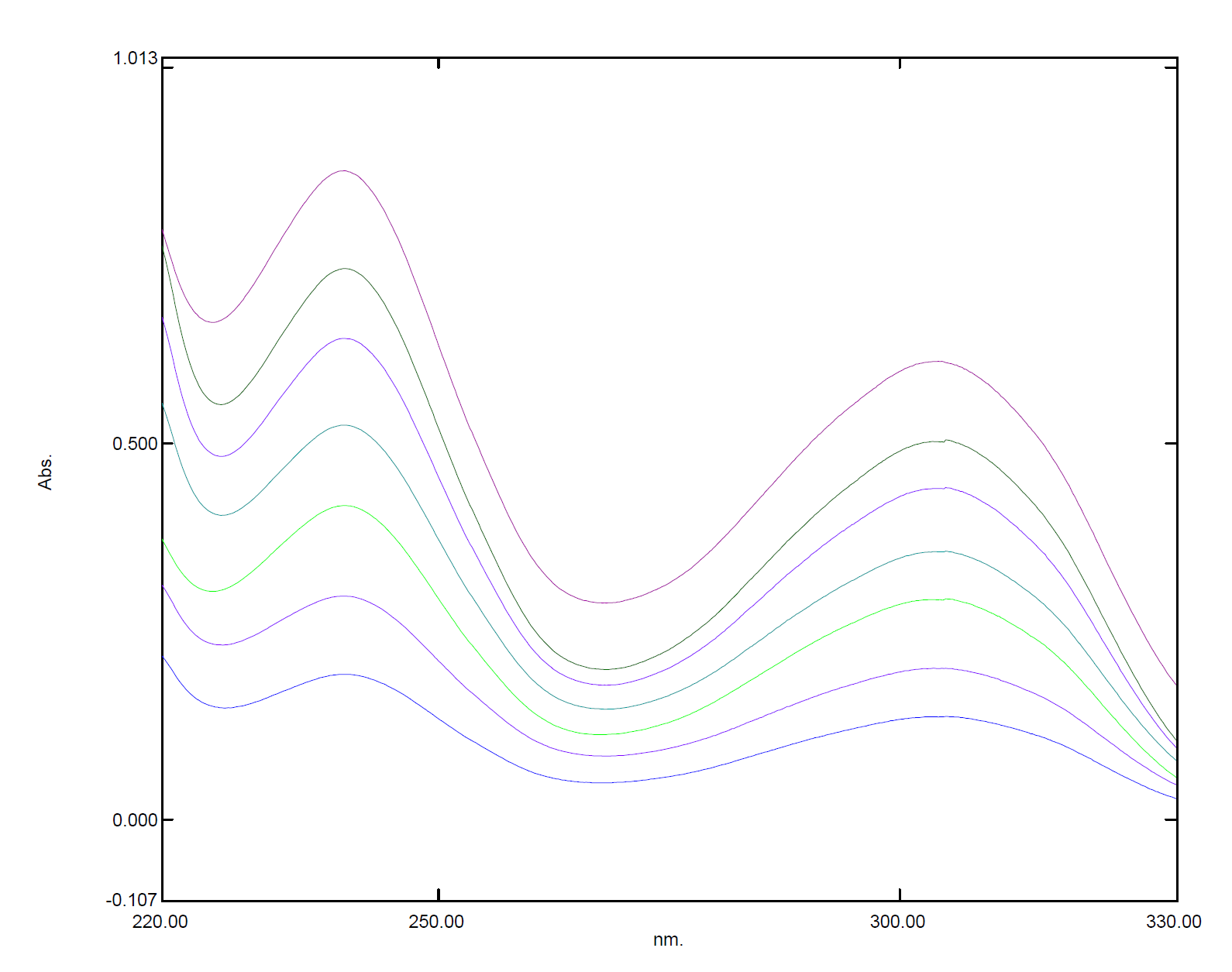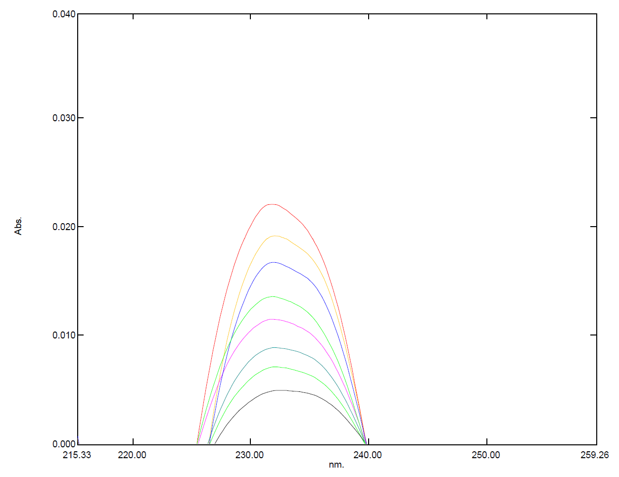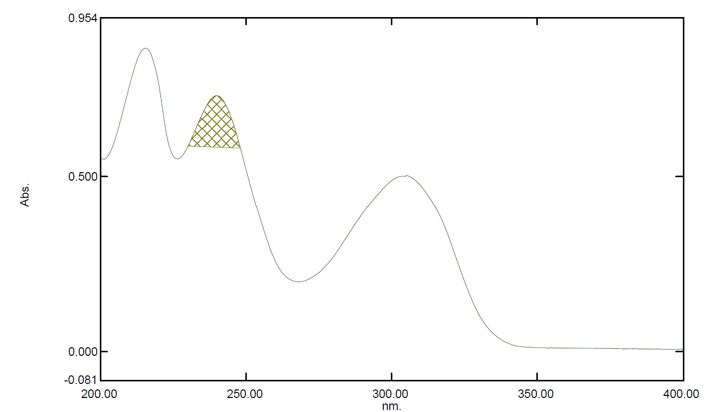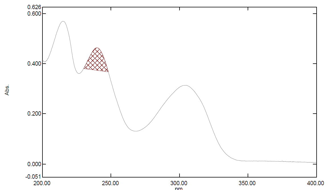 Two effective areas on the mixed spectrum directly proportional to the concentration of the desired spectral component effectively solve the broad spectrum with the methodology. A reference solution was preserved for the Phosphate Buffered Saline (pH 7.2). Samples were captured between 200 and 400 nm. Using UV probe software-2.42, the spectra between 230 and 248 nm were recorded. The area versus concentration data was used to conduct the linearity assessment.