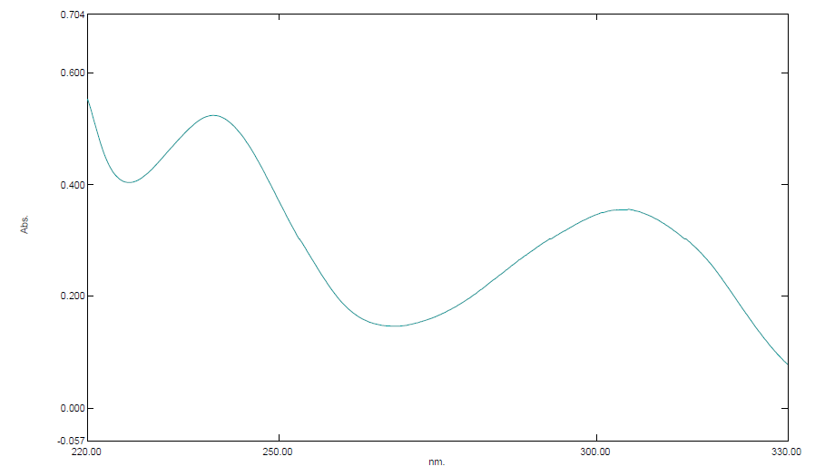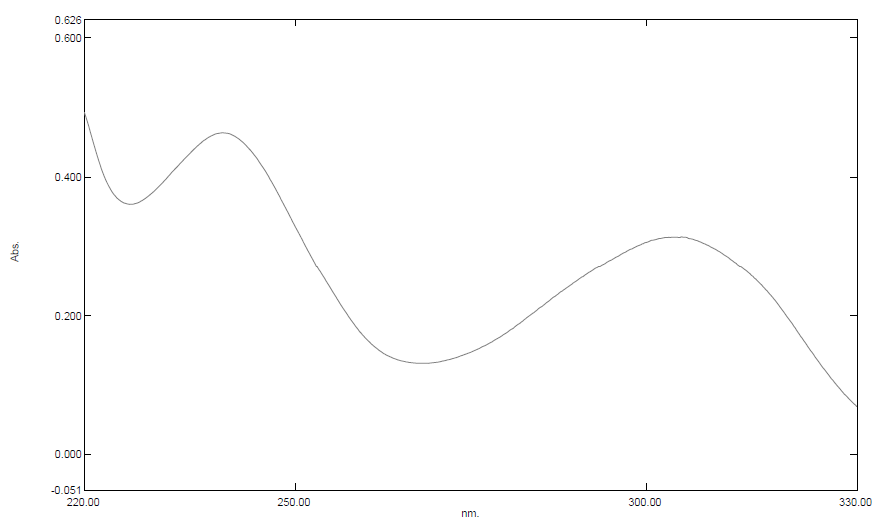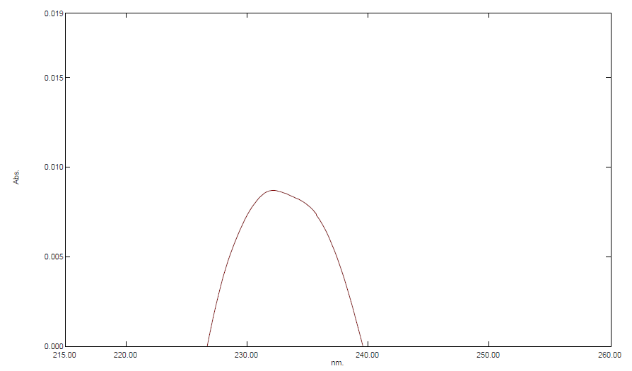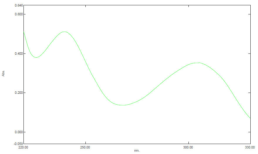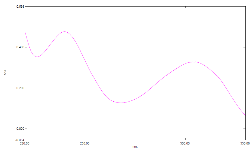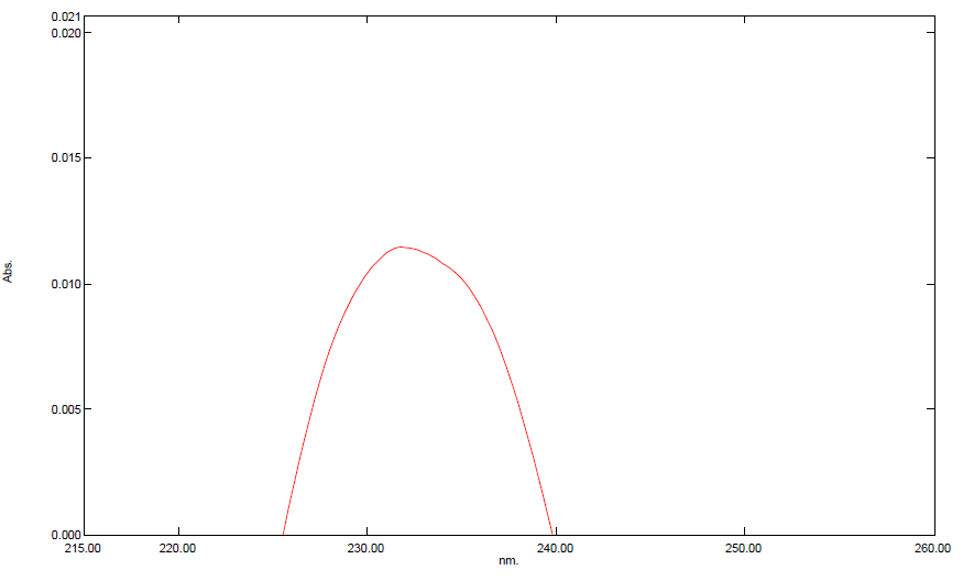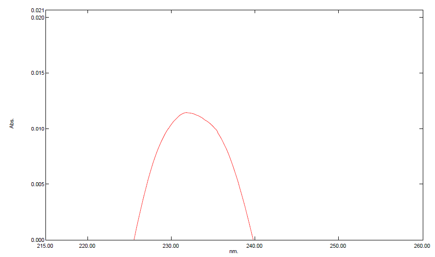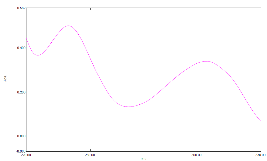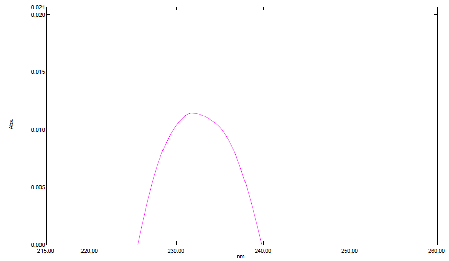 The UV-Spectroscopy principle is used to conduct numerous analyses in the simplest possible manner. The phosphate-buffered saline (pH 7.2) was kept as a blank solution. Spectra between 200 and 400 nm were measured. The zero-order spectra were transformed into first-order derivative spectra (delta lambda 8, scaling factor 1) using the inbuilt software of the instrument. After interpreting the data for linearity, the λmax was 231 nm.