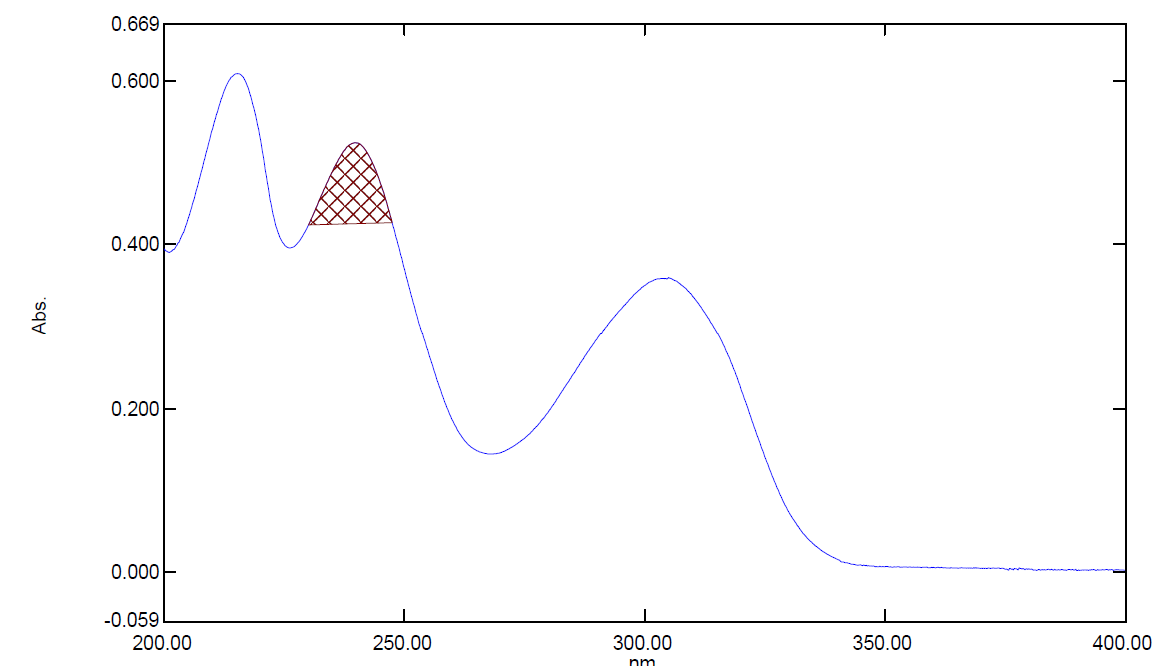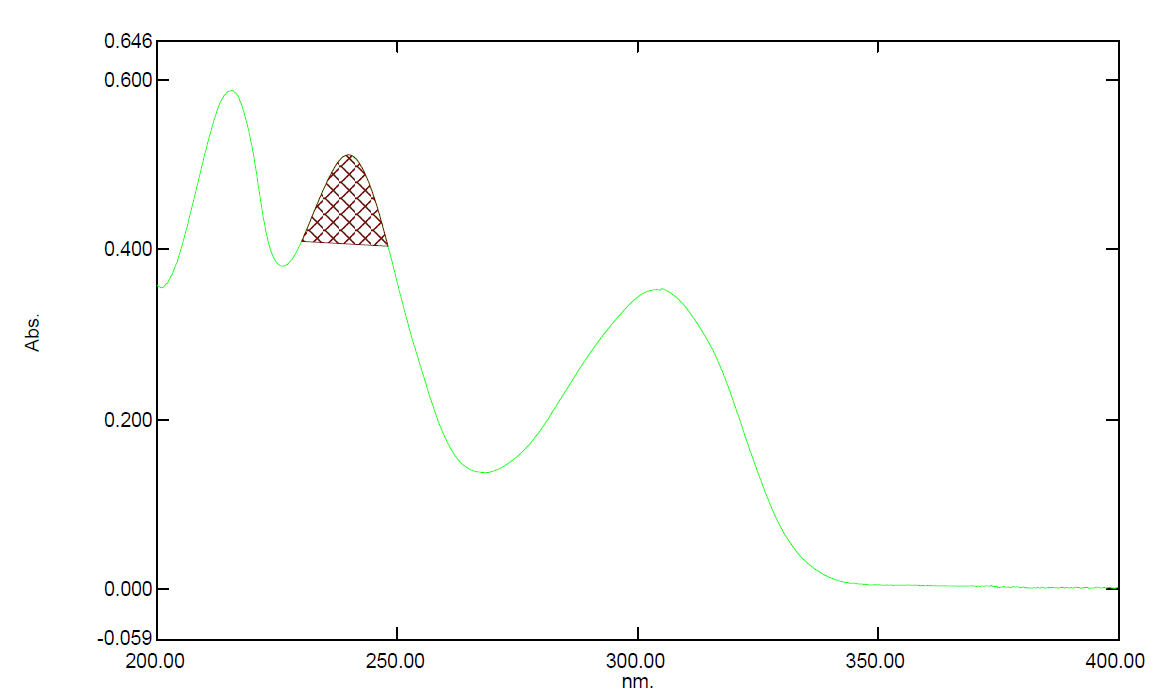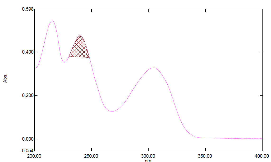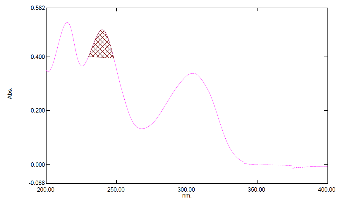 The UV-spectroscopy principle is used to conduct numerous analyses in the simplest possible manner. Phosphate Buffered Saline (pH 7.2) blank solution was kept constant. Samples from 200 to 400 nm were taken. The linearity investigation revealed that the maximum wavelength (λmax) is 239 nm.