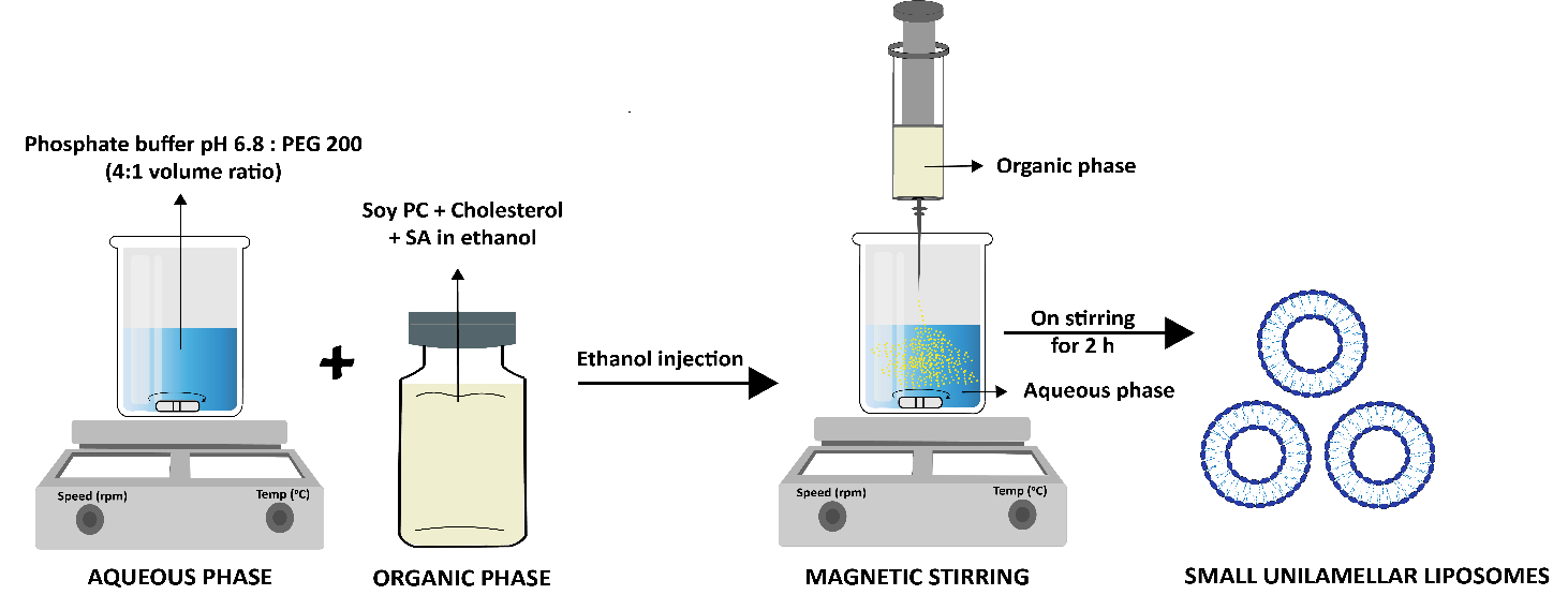 Liposomes were prepared by ethanol injection method as schematically shown in fig. 1. Accurately weighed amounts of phospholipid (soy phosphatidylcholine), cholesterol and salicylic acid were dissolved in absolute ethanol and the resultant solution was injected dropwise in a preheated aqueous phase, i.e., pH 6.8 phosphate buffer and polyethylene glycol 200 (4:1 volume ratio). The mixture was stirred and maintained at 50-55 °C temperature for 120 min duration using a hot plate magnetic stirrer. The resulting liposomal dispersion so obtained was left overnight at 4°C for maturation.