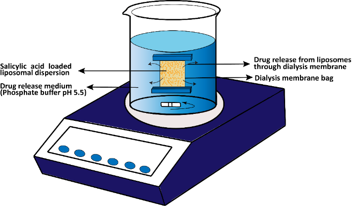 The in vitro drug release characteristic of SA-loaded liposomes was studied by dialysis method [20] using 12-14 kDa MWCO dialysis membrane-70 (HiMedia) as schematically represented in fig. 3. A treated dialysis bag (5 cm length) was filled with 1 ml of liposomal dispersion and placed into phosphate buffer pH 5.5 maintained at 37±0.5 °C and continuously stirred at 250 rpm. Samples were taken at regular intervals up to 360 min and replaced with fresh buffer. The samples were analyzed at 296 nm on a double-beam UV-Visible spectrophotometer (Shimadzu®1700).