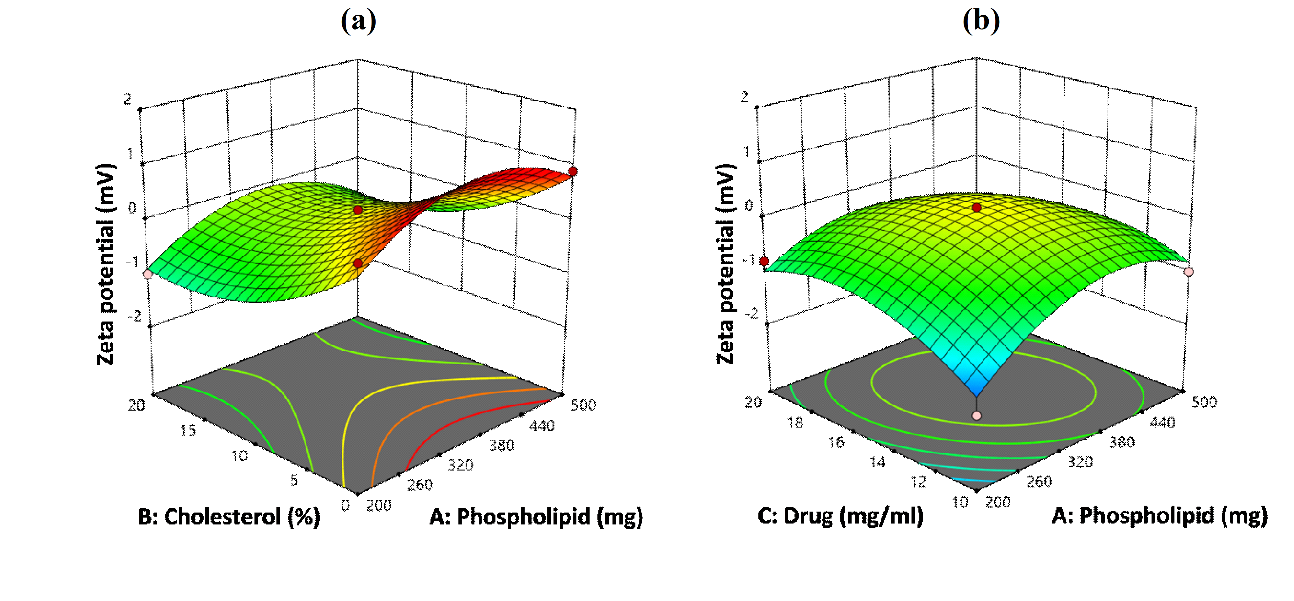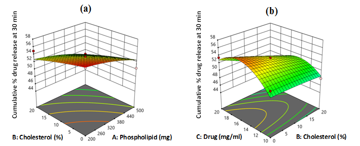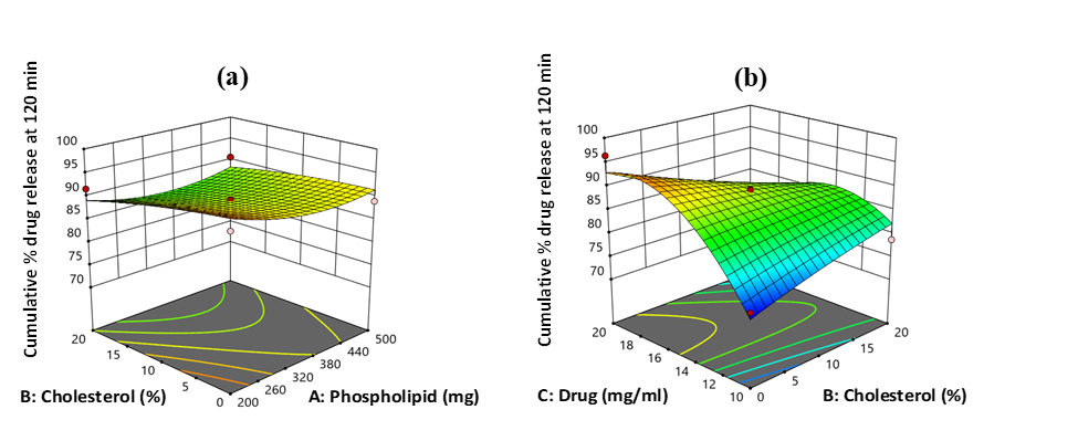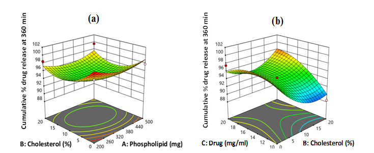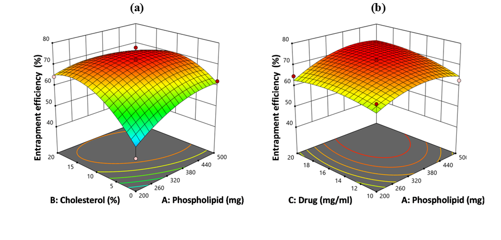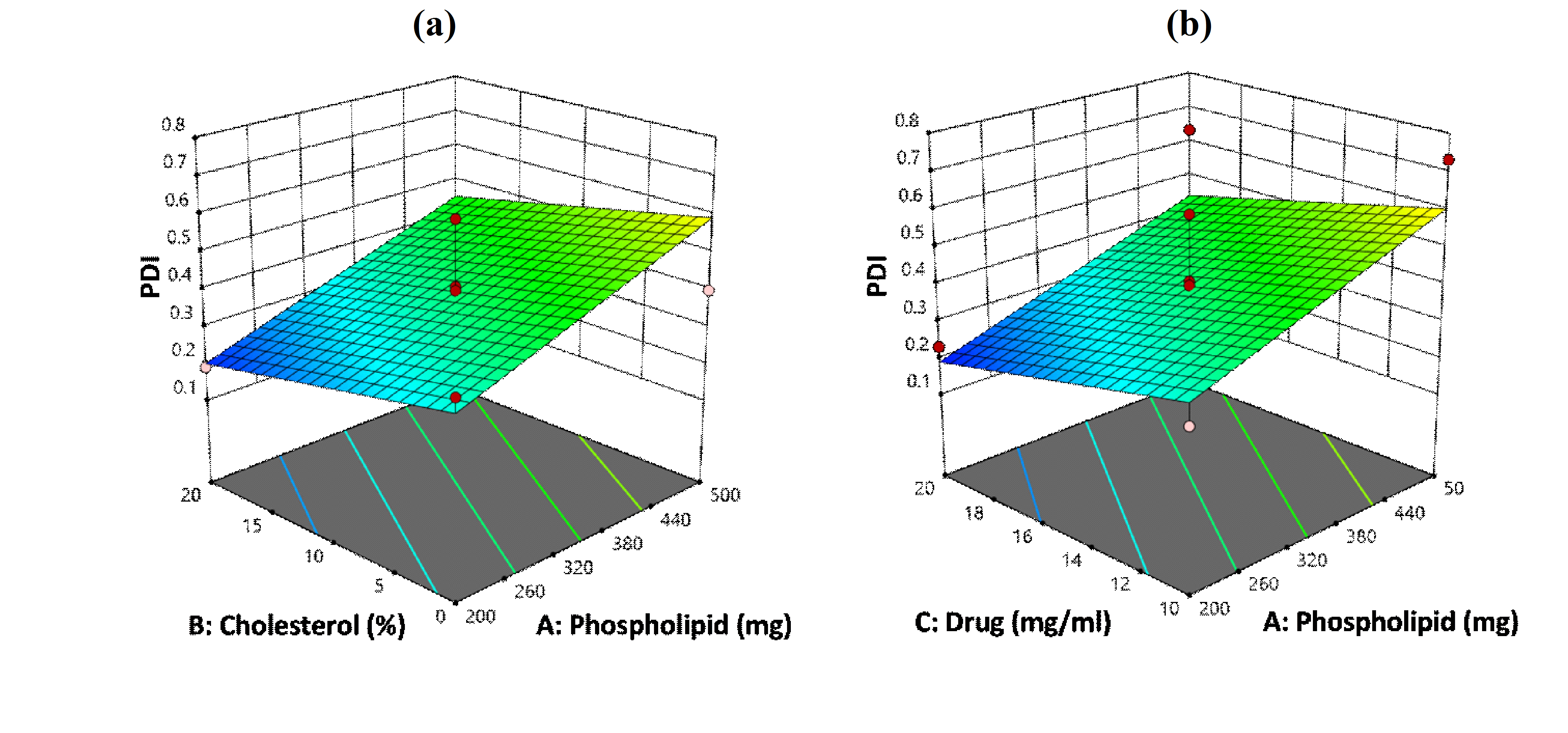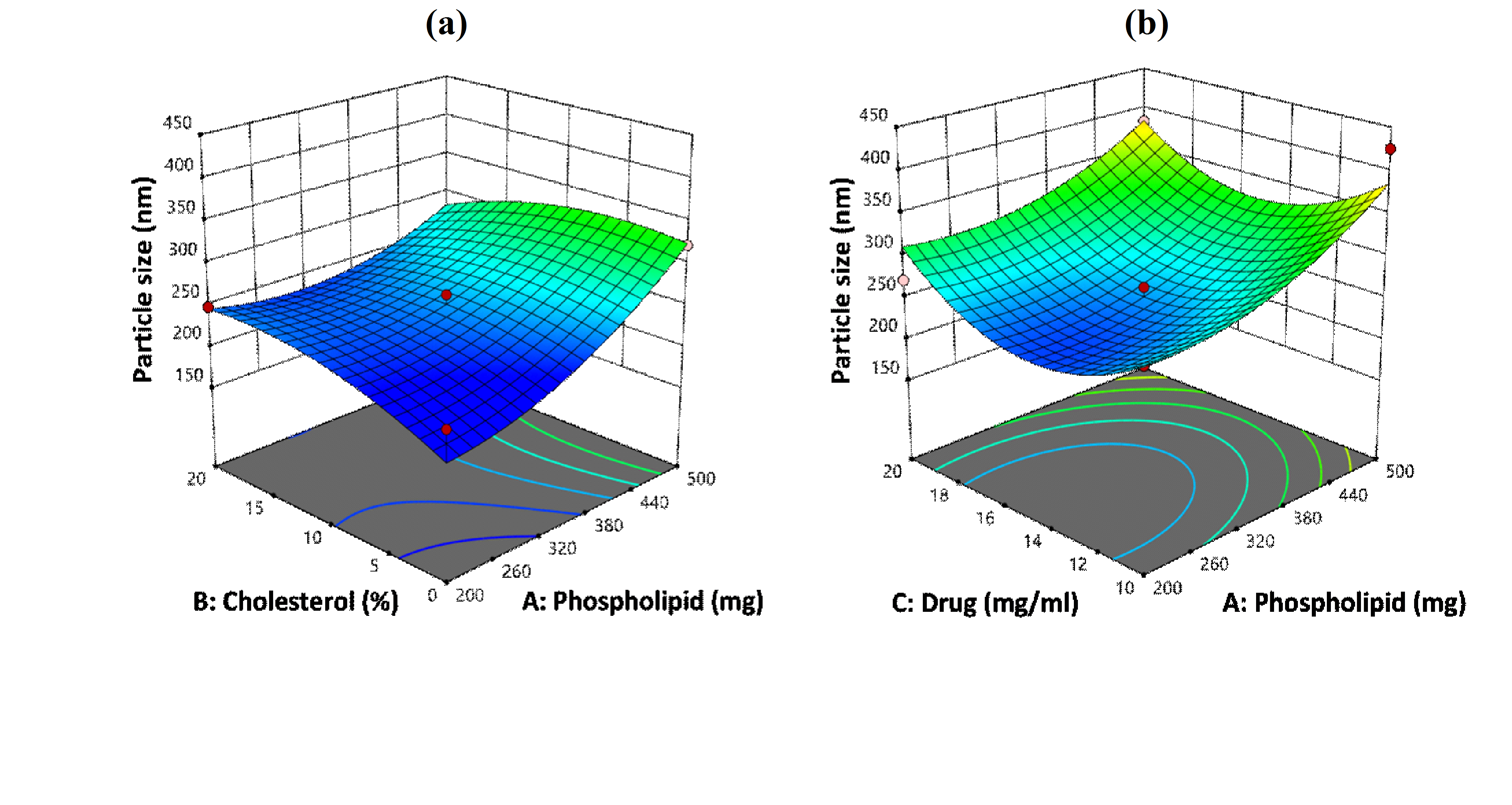 The Box-Behnken design with three center points suggested a total of fifteen trial batches and the results were obtained from the response surface variables. Sequential comparison and the lack of fit tests were used to select the best models. A sum of squares, R–squared and p-value statistical analysis was used to evaluate the design. The three-dimensional response surface plots constructed for each response variable (fig. 4-10) demonstrate the impact of changes to independent factors and their interactions on response variables. The influence of several independent parameters interacting at various levels as well as the correlation between each independent variable and the response variable were all independently assessed for every response variable of the liposomal formulation.