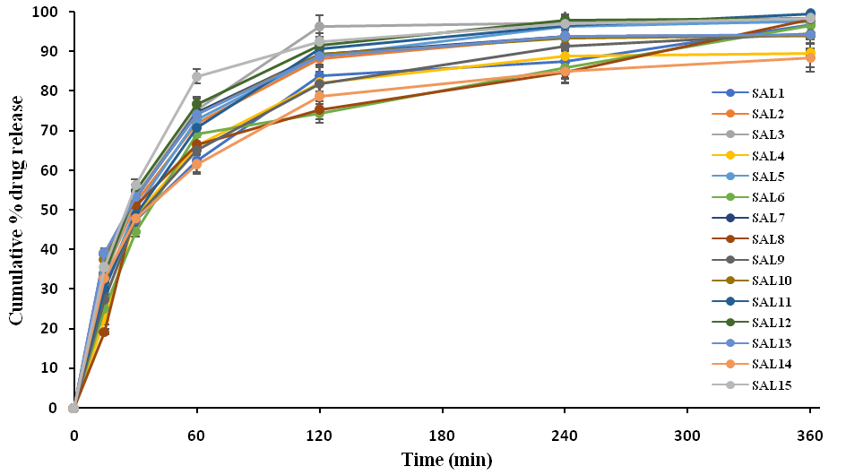 The in vitro drug release of the developed SA loaded liposomal gel was carried out in phosphate buffer pH 5.5 and drug concentration was determined spectrophotometrically at 296 nm. At 15 min, the cumulative % drug release was 22.59% and at 360 min, it was 64.48%. The results show that the formulated SA-loaded liposomal gel demonstrated sustained release pattern with an initial burst release within first 30 min.