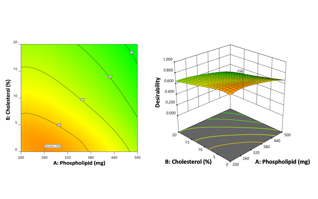 The software predicted an optimized SA-loaded liposomes taking 261.04 mg of phospholipid content, 0 % of cholesterol content and 17.59 mg/ml of drug content of (as shown in table 4) having the highest desirability value of 0.860. The predicted optimized formulation of SA-loaded liposomes were prepared according to the composition recommended by the software and evaluated for each response variable to verify the reliability of the software-predicted optimized formulation. Comparing the theoretically predicted response values with the experimentally observed response values of optimized SA-loaded liposomes, the relative error (%) was determined; which is shown in table 4.