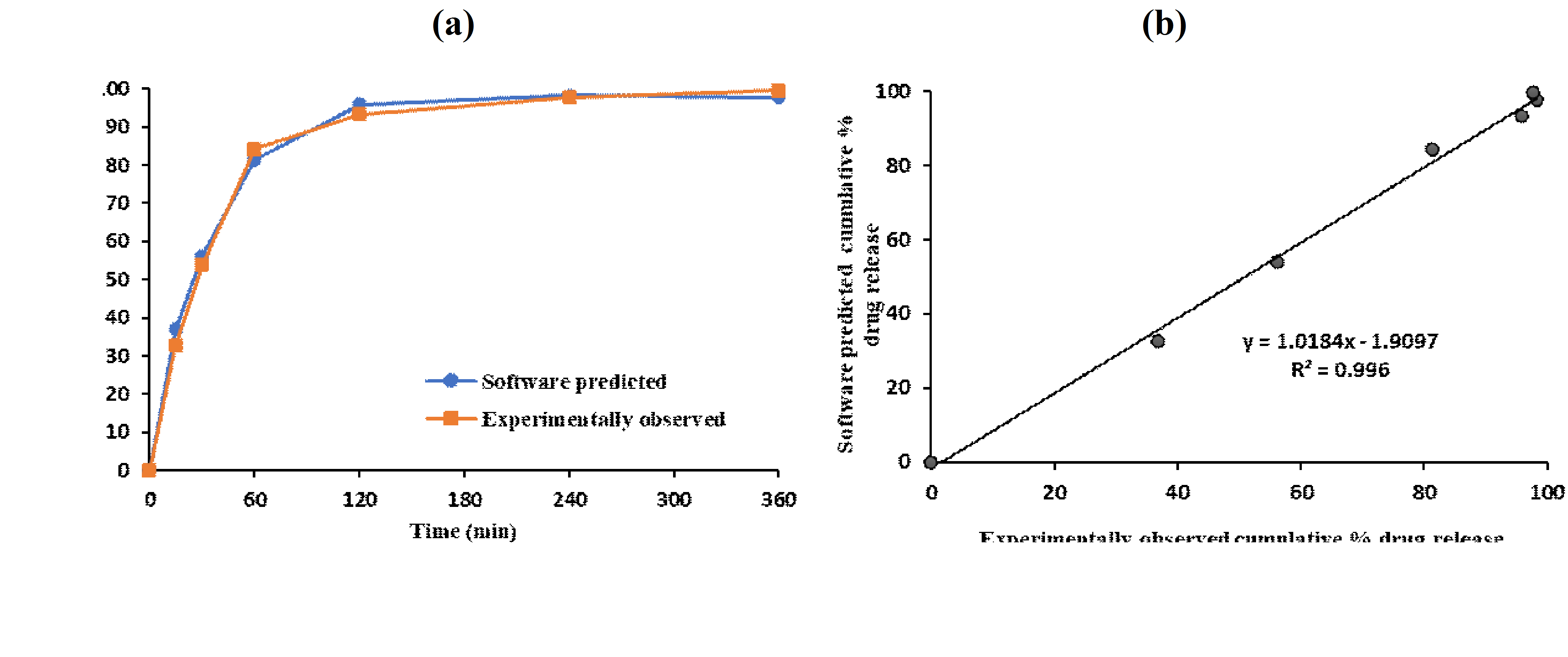 The cumulative % drug release of 15 optimization trial batch software designs varies from 19.20 to 38.97% at 15 min and 88.43 to 99.50% at 360 min, indicating a sustained drug release profile of salicylic acid liposomal dispersion. The results of the experimental observations and the software predictions were in close agreement as depicted in table 4. The graph comparing the software's predicted and experimentally observed drug release profile (fig. 13) had a high degree of agreement, with a regression coefficient of 1.018 and a correlation coefficient of 0.996. This shows that the expected and observed values of drug release were very close.