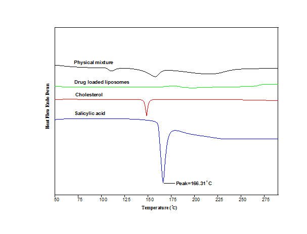 The DSC thermogram (as shown in fig. 15) determines the thermal properties of drug and excipient interactions of a formulation. The differential scanning calorimetry (DSC) thermogram of salicylic acid showed an endothermic peak at 166.3 °C, which corresponds to the melting point of the drug. This endothermic peak confirms that the sample of salicylic acid is crystalline, as the crystalline substance exhibits sharp endothermic peak due to sudden breakdown of physical bonds [53, 54]. The DSC thermogram of cholesterol also showed an endothermic peak at 152.3 °C, which is characteristic of the compound which was found in agreement with previously reposted work [55]. The physical mixture of salicylic acid and the formulation excipient showed a weak endothermic peak at 166.31 °C, which corresponds to the characteristic peak shown in pure salicylic acid. However, the DSC thermogram of SA-loaded liposomes did not show a peak corresponding to salicylic acid. This suggests that the drug was completely incorporated into the liposomal vesicles and transformed into an amorphous form.