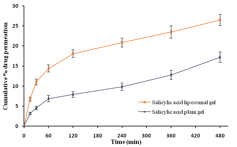 Results: The particle size, PDI, zeta potential, entrapment efficiency and cumulative % drug release of SA-loaded liposomes was found to be 261.2 nm, 0.28, 0.7 mV, 57.53% and 99.57%, respectively. Developed topical gel formulation of SA-loaded liposomes exhibited a sustained drug release profile (64.48% cumulative release over 360 min) following Higuchi model kinetics. The developed formulation showed almost 2-fold enhanced drug permeation (i.e., 26.50%) and more than 2-fold higher drug retention (i.e., 10.90%) on porcine ear skin as compared to the plain salicylic acid gel.