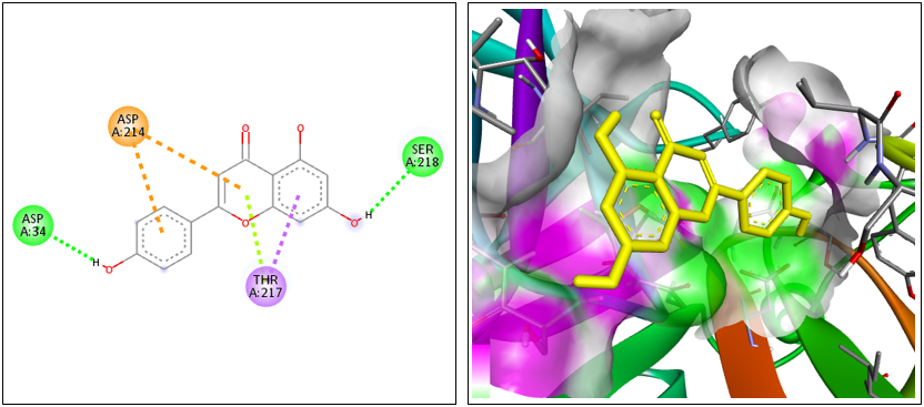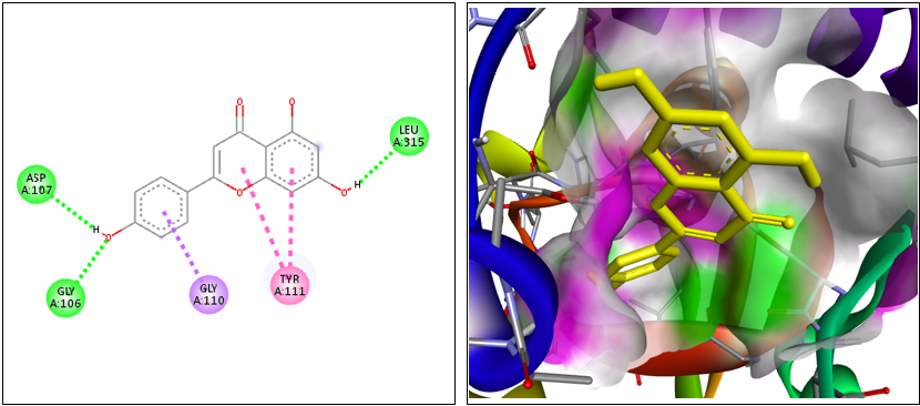 Additionally, the Pf protein-derived receptors were a great model for malaria receptors. Since the receptor with resolution value 3A was closest to 2 Armstrong, it was considered the most acceptable receptor for the standard [27]. The resolution value describes how closely the generated structure mimics the original receptor structure. The validation results of the molecular docking approach on the Pf receptors showed the importance of the RMSD values. The RMSD number, which had to be less than 2 Armstrong, was used to reflect the variation in native ligand locations during docking and redocking [28]. The results showed that all four receptors, triose-phosphate, lactate dehydrogenase enoyl-acyl carrier and plasmepsin II had RMSD values of 1.522 A, 1.94 A, 0.940 A and 2.638 A respectively; the values for free energy binding were 5.97 kcal/mol, 5.87 kcal/mol, 12.50 kcal/mol, and 9.27 kcal/mol (table 1). The receptors interacted with hydrogen and non-hydrogen bonds on various amino acid residues. The findings of the molecular docking screening show that these values met the criteria for evaluating API as an antimalarial [29]. The results showed that two of the four experiments (Apigenin on Enoyl-Acyl Carrier and Triose-Phosphate receptors) suggested a potential effect, as evidenced by the lowest free energy binding values observed at-8.06 kcal/mol and-8.76 kcal/mol, respectively. Lower energy activation is correlated with lower free energy binding. As a result, there's a probability that the Apigenin substance and the receptors will interact with one another and trigger a spontaneous reaction [30]. In Addition, concerning Triose-Phosphate, Lactate Dehydrogenase, Enoyl-Acyl Carrier Protein, and Plasmepsin II, the API molecule has a lower value of the inhibition constant as indicated by the constant inhibition results (376.76 nM, 44.06 M, 1.24 M, and 57.04 M, respectively). A relatively low number is considered to have substantial power since the molecule has a significant inhibitory capacity at low doses, which signifies the ability of the substance to block receptors or enzymes [31]. When the energy and inhibition constants are considered, one of the variables influencing the compound's activities is how its structure interacts with the amino acids at its receptors. Through similar amino acid residues (SER218 for the 1LF3 receptor, LEU315, GLY110, and TYR111 for the 1NWH receptor, VAL212, LYS12, ASN233, and GLY232 for the 1O5X receptor, and ILE31, PRO250, and PRO246 for the 1U4O receptor), the API molecule interacts similarly with the native ligands (fig. 1.) Since we are aware that this contact is reversible and substantially stronger than other forms of interaction, we additionally highlighted the hydrogen bonding interaction of the API (table 2) based on the data [32,33]. The comparative experiment demonstrates the same activity in binding the receptor between the lead and API compounds. API competitive binding to receptors' active pockets can prevent this Pf from activating. This mechanism of action slows down the growth of Pf. The API compound hydroxyl functional groups behave as hydrogen-bonding donors. Acceptors in pharmacophore modeling studies, interacting with receptor amino acids including ASP34, SER218, ASP107, GLY106, LEU315, VAL212, GLY210, GLU165, LYS12, SER245, and ARG171 (fig. 2). The key elements that form bonds with significant amino acid residues of receptors are hydroxyl. At the same time, the benzopyran group may play a part in altering the structure of this molecule during drug development in the future due to their possible interaction with significant amino acid residues, as observed from the results of pharmacophore modeling. As a result, API may eventually be developed into a medication with high efficacy, favorable physicochemical characteristics, and minimal side effects.