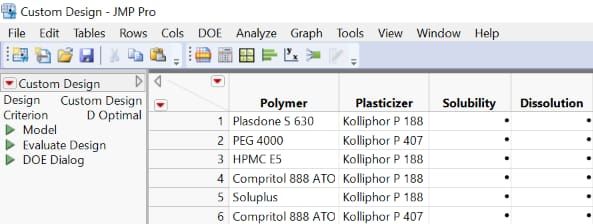 The Design of the experimental approach was used to finalize the screening of polymers for the Solid Dispersion process. JMP software was used for the DoE.