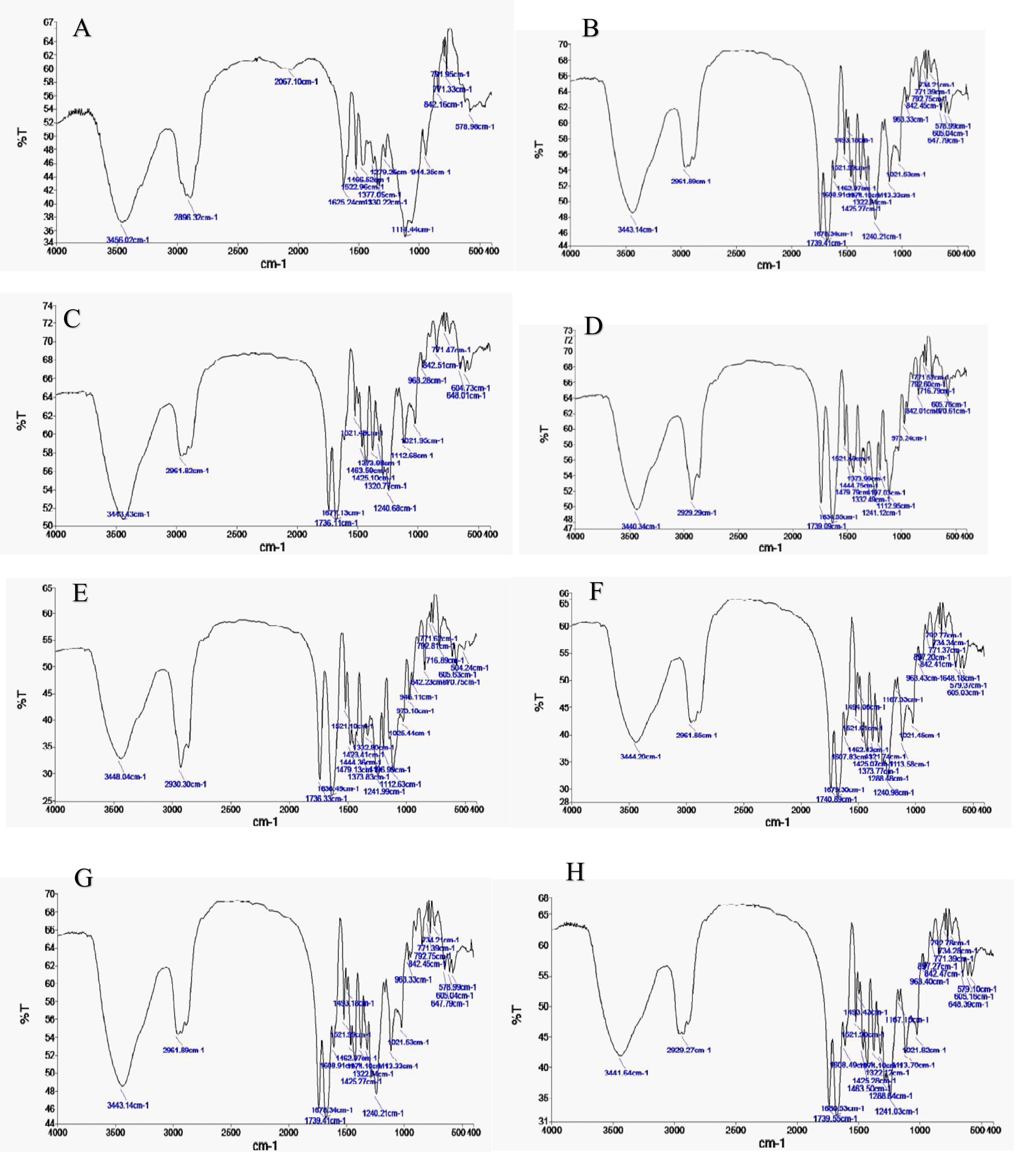 Fig. 3: FTIR graph of (A) SD-7, (B) SD-8, (C) SD-9, (D) SD-10, (E) SD-11, (F) SD-12, (G) SD-13, and (H) SD-14