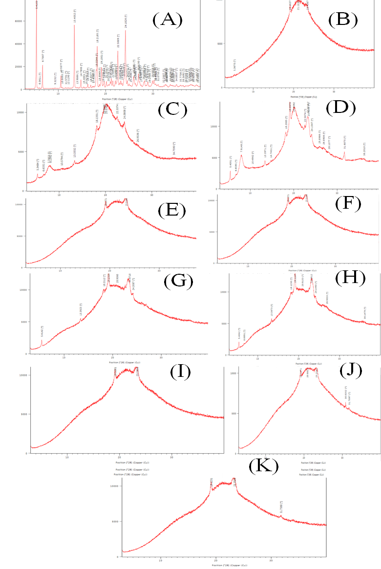 Fig. 4: XRD graph of (A) Pure drug, (B) SD-2, (C) SD-4, (D) SD-7, (E) SD-8, (F) SD-9, (G) SD-10, (H) SD-11, (I) SD-12, (J) SD-13, and (K) SD-14. On the other hand, pure carrier polymers exhibit characteristic broad, amorphous halos in the case of SD-2 and SD-4, as seen in fig. 7. This indicates the conversion of the crystalline state of the drug into the amorphous state. As the amount of polymeric carriers increases and exceeds a threshold level, amorphous halos start to appear, indicating the possible crystalline-to-amorphous transition