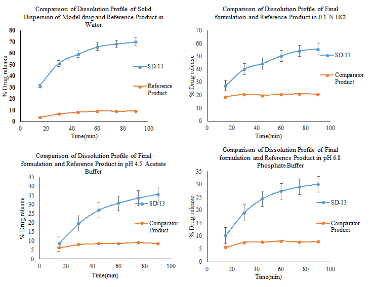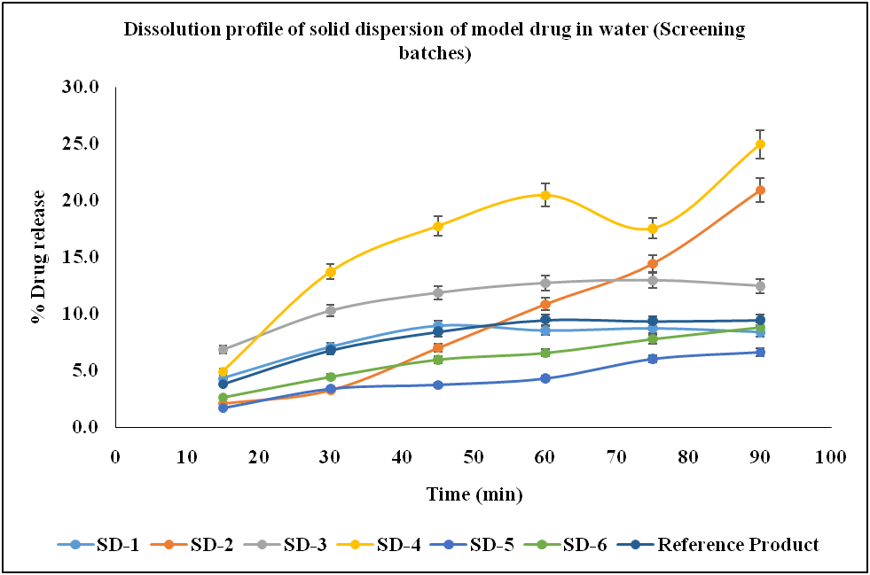 In vitro drug release of different SDs was compared with the reference product in water. SD-7 showed a modified-release pattern and was not used in further studies as the formulation is an immediate-release formulation. A comparison of the % drug release of screening batches of Model drugs in water has been presented in fig. 5.