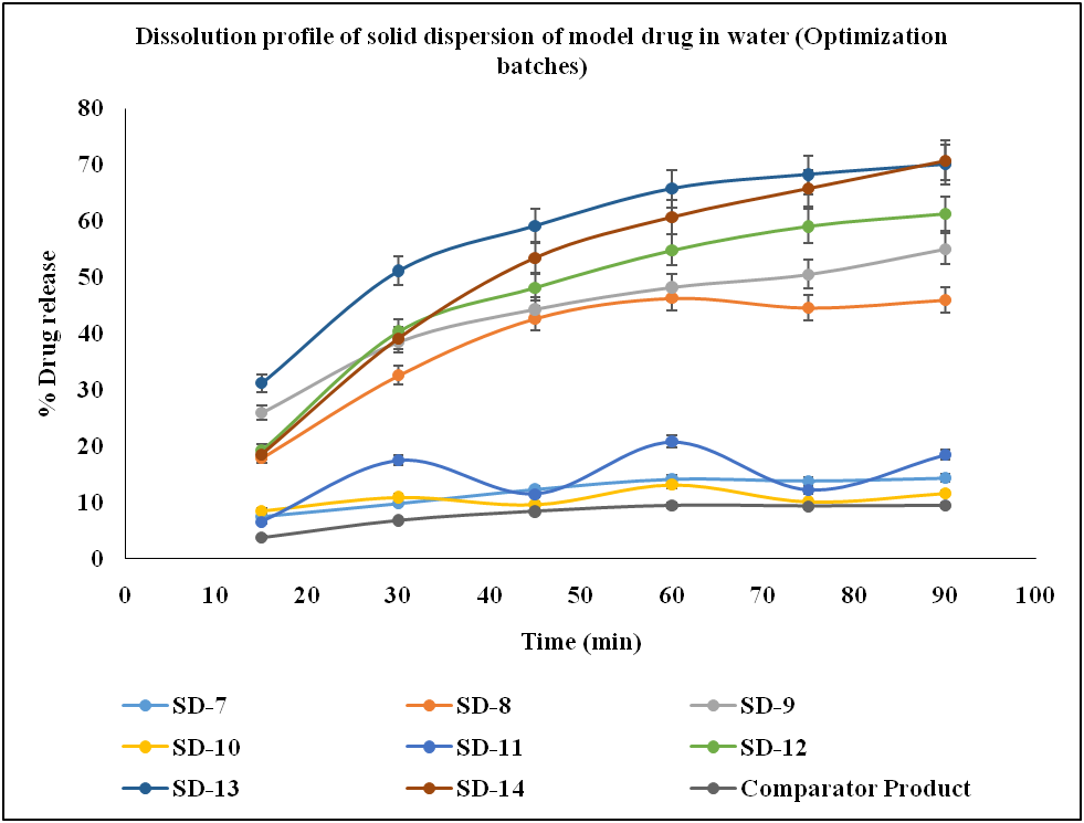 As compared to the drug release of the reference product (9.4±1.1%), the drug release of solid dispersion of the optimization batches was higher within 90 min of dissolution studies. The formulation SD-13 and SD-14 showed the maximum drug release of 70.0±4.4%, and 70.7±2.9%, respectively, within 90 min of dissolution studies. The comparison graph can be seen in fig. 4, where the % drug release of optimization batches of solid dispersion versus time (in min) are graphically represented. Comparison of % drug release of Optimization batches of Model drugs in water has been presented in fig. 6.