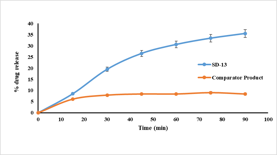The drug release of the final formulation SD-13 was found to be 99.1±3.8% at 60 min in 0.2% w/v Polysorbate-80 in water. The media is the OGD media for the model drug recommended by the FDA. The graphical representation of a comparison of the drug release of the final formulation and reference product can be seen in fig. 8. The final formulation fits into the category of immediate-release drug formulations.