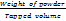 The funnel method was used to calculate the powder's angle of repose. The hopper was filled with the powder mixture and weighted down. The funnel's height was adjusted such that its tip barely touched the surface of the powder mixture. The hopper was left open, allowing the powder mixture to pour freely onto the ground. The powder cone's diameter was measured, and the following equation was used to determine the angle of repose [24].