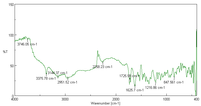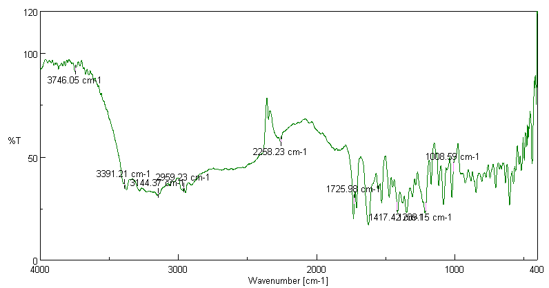 To determine the compatibility of Tribulus terrestris with its polymers and formulation, FTIR spectroscopy was applied to the pure drug extract Tribulus terrestris and the solid mixture of drug and various excipients with the formulation. The IR transmission spectra of the drug, the polymer, and the formulation are provided in (fig. 1 and 2) [31, 32]. All peaks were present in their original positions, indicating that there is no interaction between the drug and the excipients. The characteristic peak of Tribulus terrestris is 3391.21 cm-1 due to its amino group i.e. N-H stretching. Another characteristic peaks present were 3746.05 cm-1 (-OHStretch), 2959.23 cm-1 (C-H bending), 2258.23 cm-1 (C=Cstretching), 1725.98 cm-1 (C=O) stretching), 1200.15 cm-1(C-OH stretching). Similarly, the polymer utilised in the formulation displayed characteristic peaks that were unique from the drug, indicating that the drug is compatible with the polymer and leads to good stability.