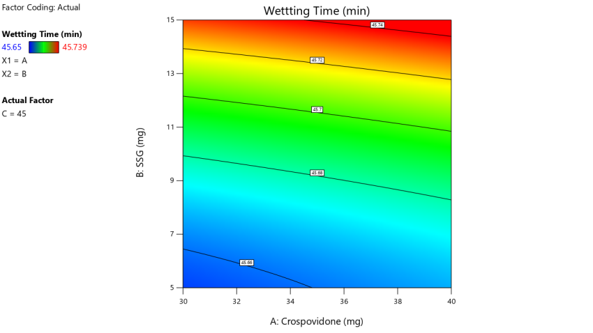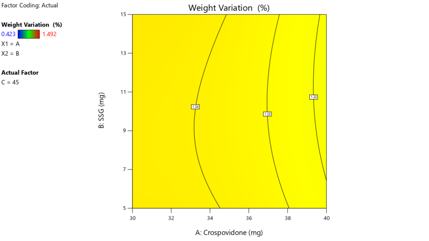 Analysis of variance revealed that all polynomial equations were statistically significant (P≤0.005) [33]. (ANOVA). The results of an ANOVA are shown in table 6 for each of the three replies. Table 5's multiple linear regression analysis findings show that all responses—weight variation, disintegration time, dispersion time, and content uniformity-were negatively impacted by the concentration of SSG (X2), but crospovidone (X1) had a negative impact on just some of these variables. This indicates a beneficial effect because as the concentration of crospovidone grows, the dispersion time increases along with the disintegration time, but when the concentration of SSG increases, both the dispersion time and the disintegration time increase. Therefore, high crospovidone and medium SSG dosage should be used to ensure that the tablets disintegrate quickly.
