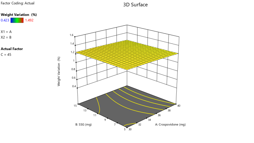 Table 6 summarises the results of the ANOVA for each of the three answers. The results of the multiple linear regression analysis, shown in table 5, indicate that the concentration of SSG (X2) had a negative effect, while the amount of crospovidone (X1) had a negative effect for all responses, i. H. Weight variation, disintegration time, dispersion time, and content uniformity. This means that the amount of crospovidone has a positive impact when the dispersion time, disintegration time, and dispersion time all increase. In comparison, the amount of SSG has a negative effect when both the dispersion time and the disintegration time rise. So, for the tablets to dissolve quickly, high crospovidone and medium SSG dosage should be used. Using surface response plots, the relationship between the dependent and independent variables was further clarified [25, 29]. The data from the response surface plots [fig. 5-7] showed that both X1 and X2 have an impact on the drug's disintegration, dispersion, and uniformity of content.