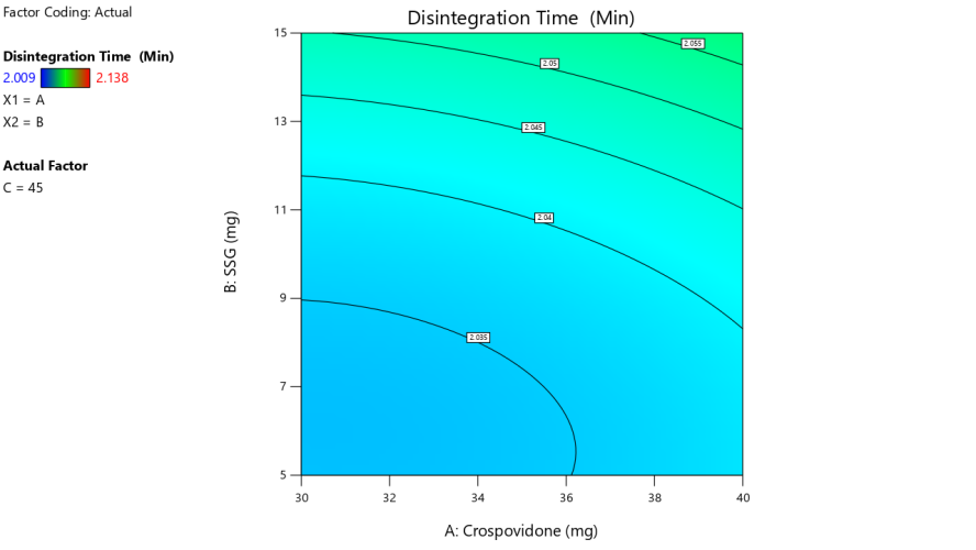 Disintegration Time =+2.04+0.0031*A+0.0090*B-0.0256*C+0.0009* AB+0.0013A²+0.0052 B².