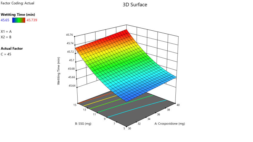 Fig. 7: Responses surface plots showing the effect of concentration of crosspovidone and SSG on measured responses of wetting time (sec)