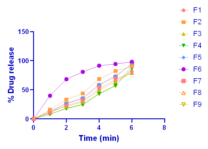 To determine the effect of cross povidone and SSG on the release pattern of Tribulus terrestris, the in vitro drug release tests of the manufactured MDTs were carried out (fig. 8). In 5 min, the drug release increased to 94.27% (F6). According to the findings, MDTs with 40 mg of Crospovidone and 10 mg of SSG are the formulation that maximizes Tribulus terrestris release [34].