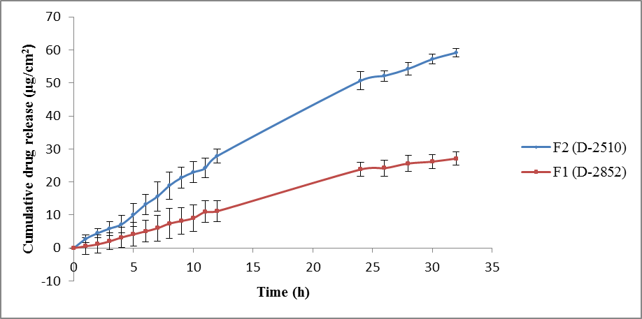 The diffusion coefficient of a drug in a Pressure-sensitive adhesive (PSA) DIA patches is influenced by functional groups present in the drug. In the present study, Durotak-2510(D-2510) with hydroxyl functional group and Durotak-2852(D-2582) with carboxyl functional group were selected (Henkel Corporation). Furosemide was loaded at a concentration of 5% w/w of adhesive weight. The cumulative drug release profile of DIA patches of D-2510 and D-2852 without penetration enhancers, i.e., F1 and F2 was plotted (Fig. 2) and the results were reported in table 3. The release studies revealed a 2.1 times higher flux for D-2510 when compared with D-2852 [21]. The low penetration of the drug from D-2852 was due to carboxyl group interaction with the functional group present in the drug. The highest permeation of galantine was observed with hydroxyl-containing (Duro-Tak-2510) [22]. Previous studies reports that the selection of functional and non-functional pressure-sensitive adhesive depends on the functional groups present in the drug as they influences the drug release from DIA matrix [23, 24]. Drugs with secondary amino groups markedly interact with the PSA carboxyl group [25]. Miyajima et al. (1999) reported that the stronger the drug-polymer interactions the greater the reducing the drug diffusion rate [26]. In the current investigation also the drug release rate was found to be less from PSAs containing a carboxyl group (D-2852) than PSAs containing no functional group or a hydroxyl group (D-2510). Hence the pressure-sensitive adhesive D-2510 was selected for further studies.