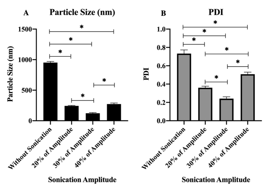 Fig. 2: Particle size (A) and PDI (B) of F1 in different sonication amplitude. Each measurement was performed in triplicate (n=3), and data are presented as mean±SD. Where * = significant difference (p<0.05)