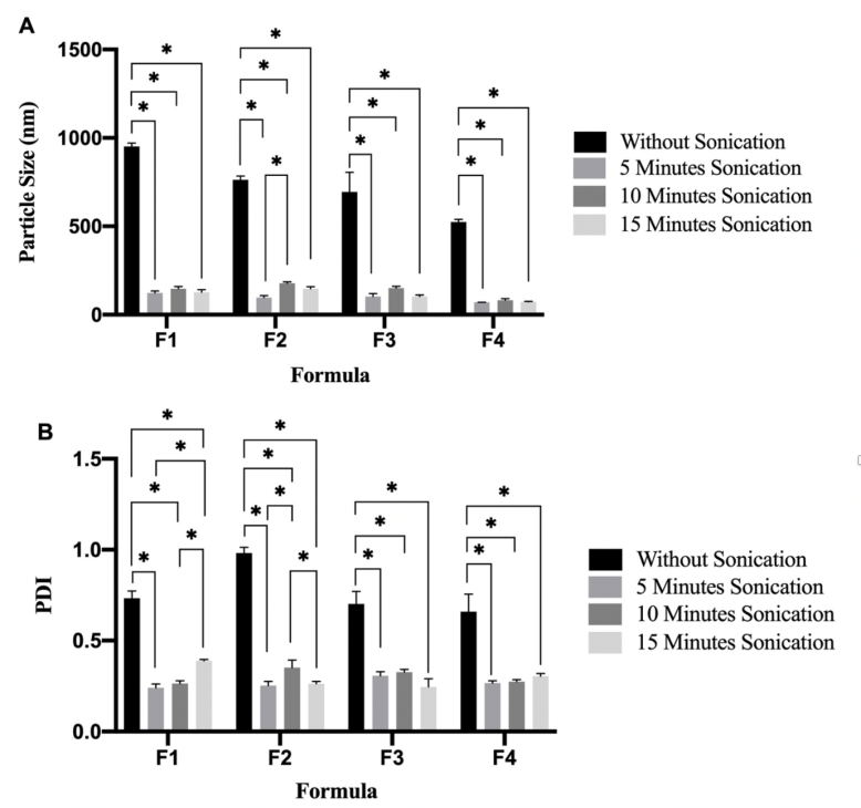 Transethosome were prepared using the procedures outlined in the section preparation of transethosomes. The sonication time was 5, 10, and 15 min, respectively. Then vesicle size and PDI were evaluated in all four formulations.